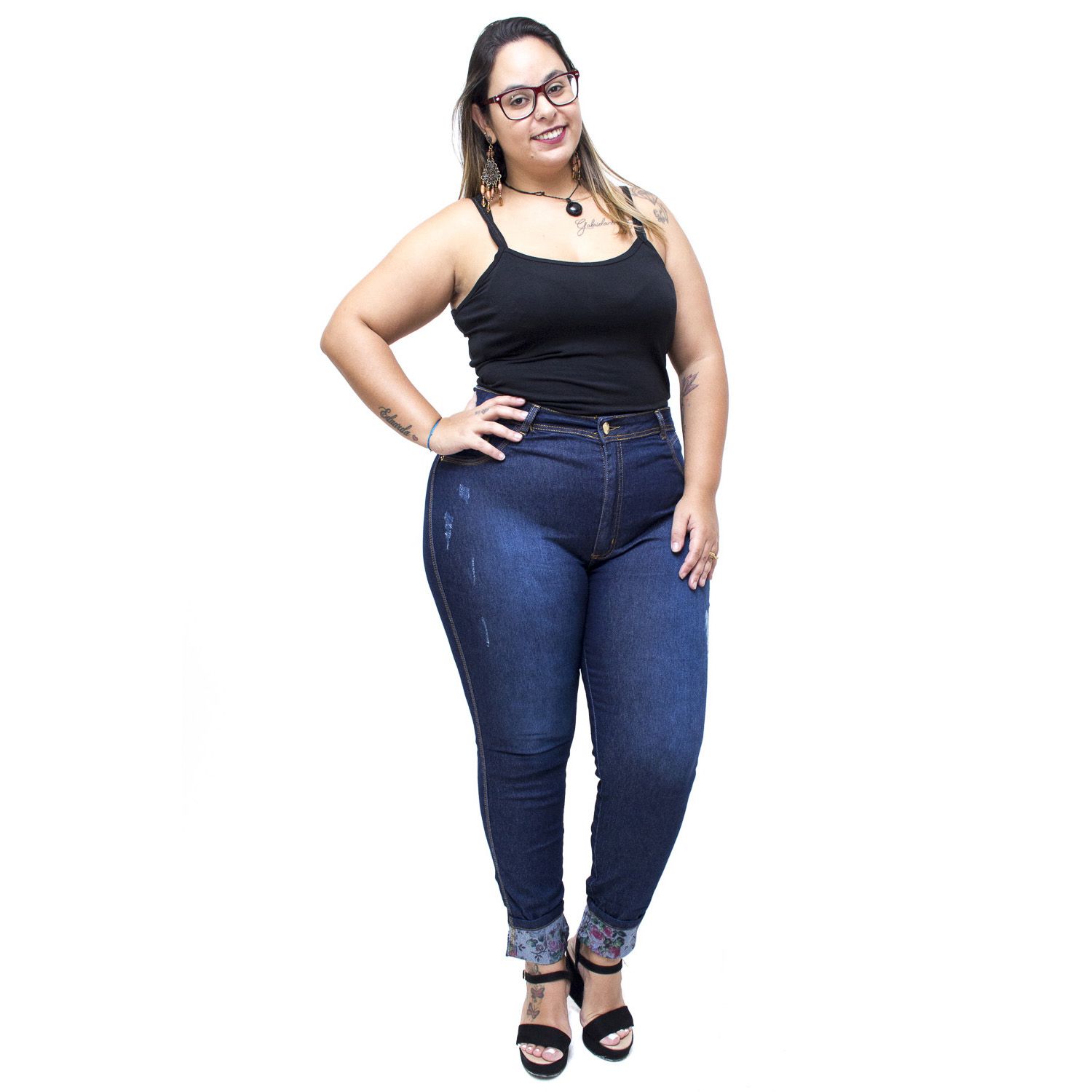 Calça Jeans Plus Size Levanta Bumbum, Modelo Skinny Azul Escura com Cintura Alta, Bolsos Traseiros Funcionais e Falsos na Frente, Fecho com Zíper e um Botão. Barras Dobradas com Detalhes Estampado, Pode ser Desdobrada e Aumenta uns 8cm no Comprimento. Detalhes em Puídos.