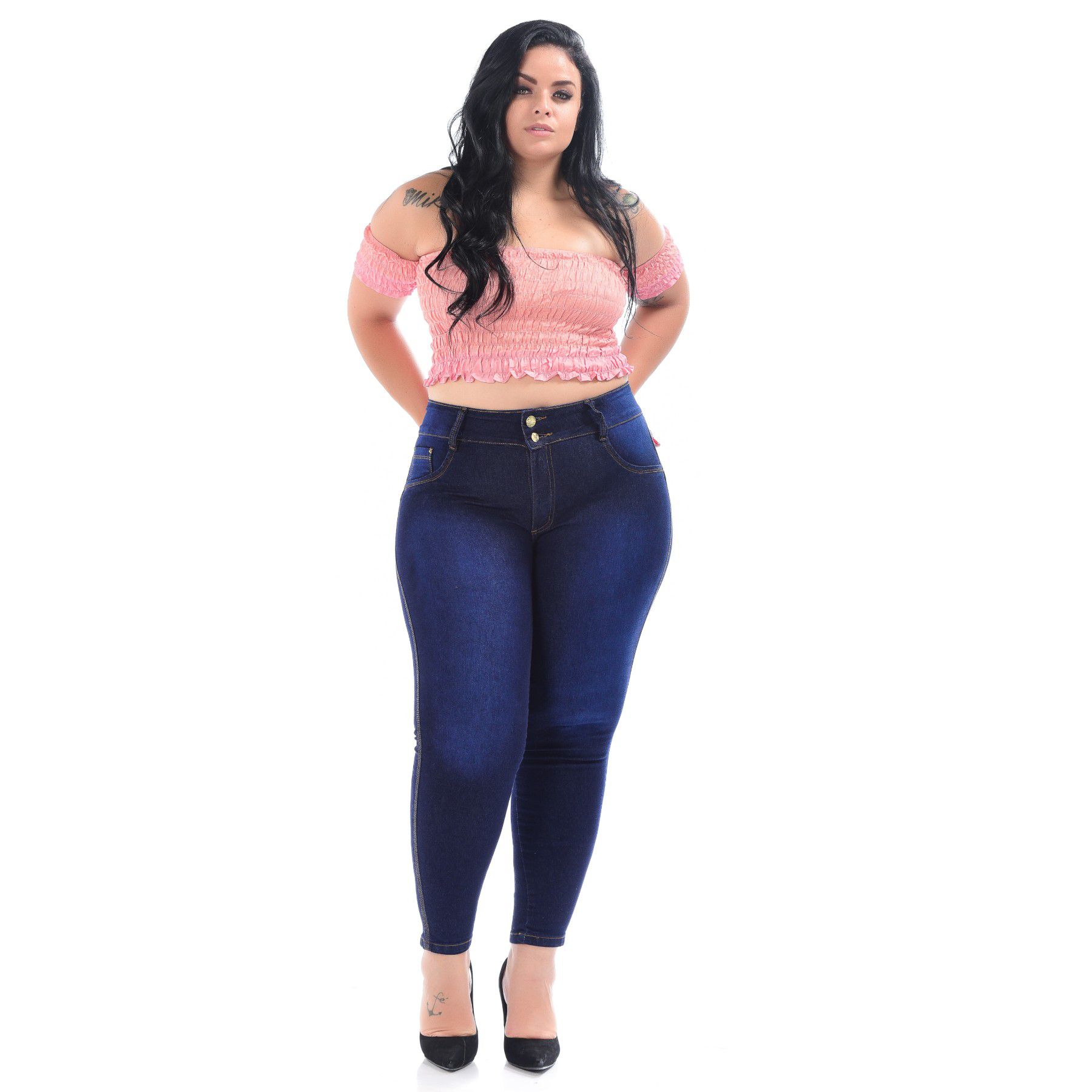 Calça Jeans Plus Size Levanta Bumbum, Modelo Skinny Azul Escura. Cintura Alta. Bolsos Traseiros Funcionais e Falsos na Frente, Fecho com Zíper e um Botão. Possui Elástico na Cintura.