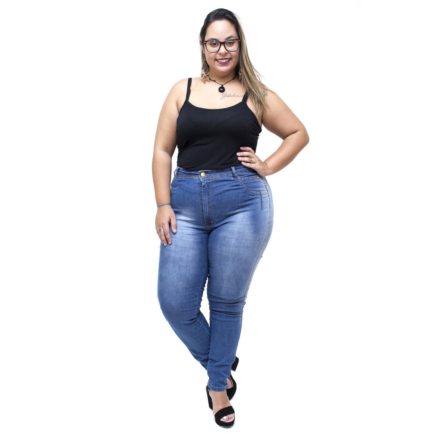 Calça Jeans Plus Size Levanta Bumbum, Modelo Skinny Azul Clara com Cintura Alta, Bolsos Traseiros Funcionais e Mini Bolsos na Frente, Fecho com Zíper e um Botão.