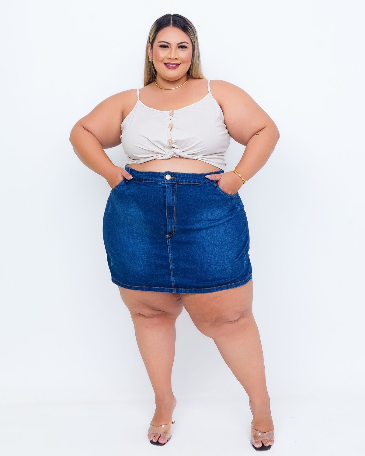 Shorts Saia Jeans Plus Size Levanta Bumbum, azul, cintura alta, bolsos frontais e traseiros funcionais, fecho com zíper e um botão, detalhes de puído.